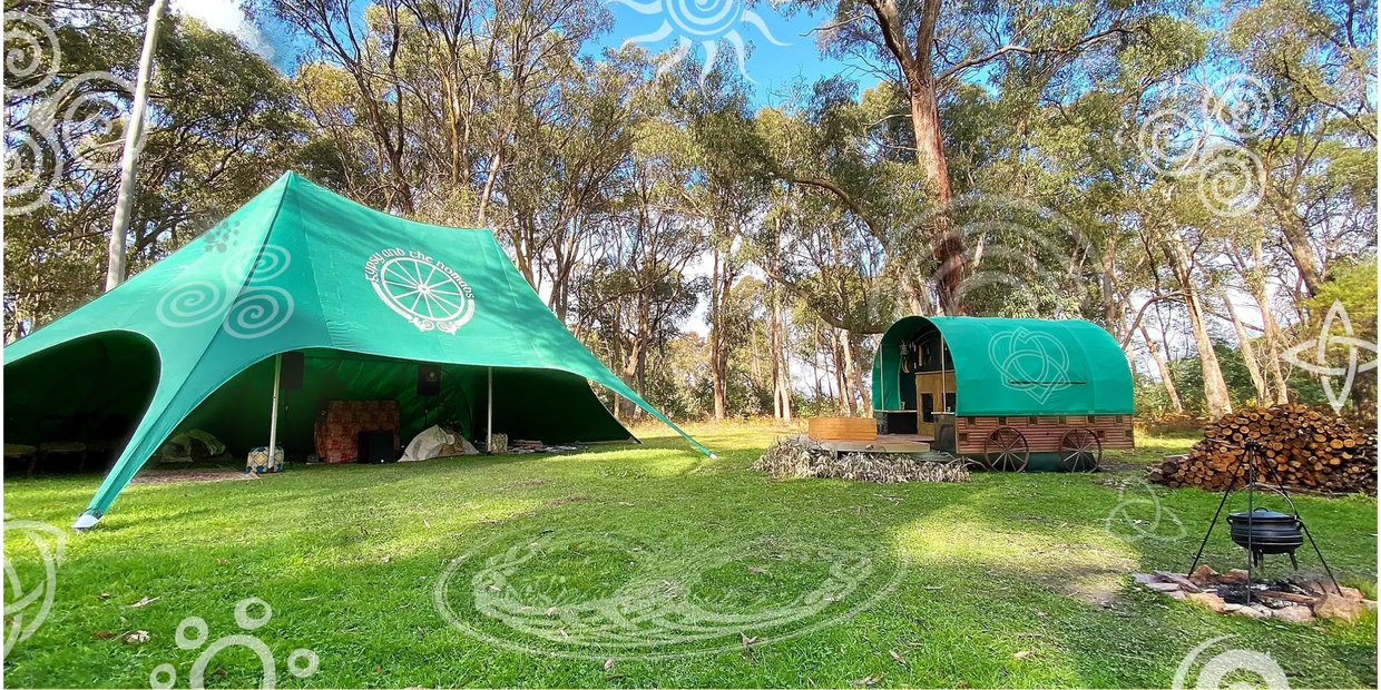 A festival setup featuring a wagon, plant based food & drinks, holistic practices & energy healings, a sanctuary tent, DJ sets, sound, stage, lighting, bringing a nomadic spirit to the celebration.
